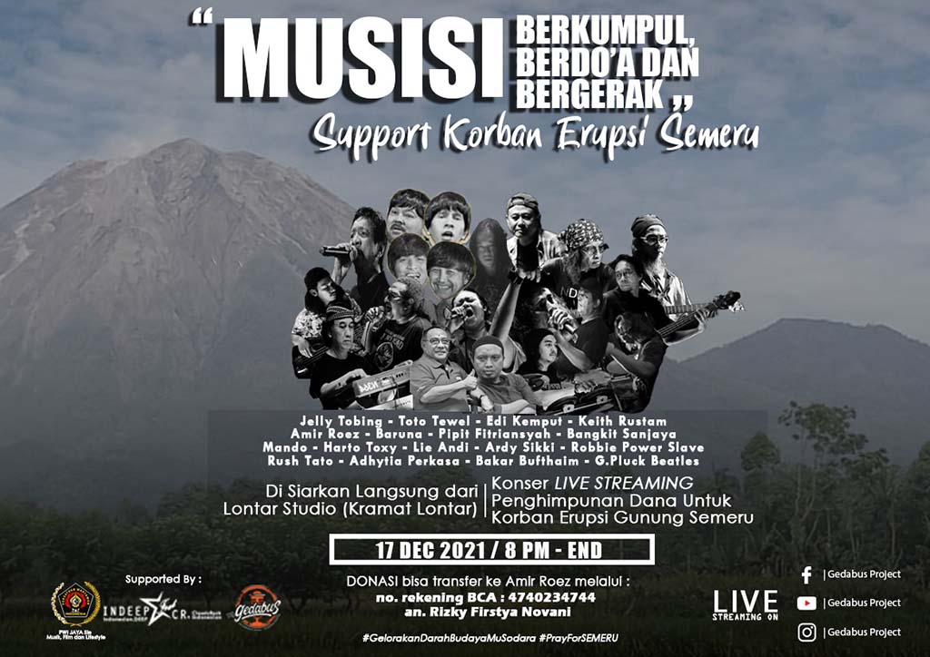 Konser bertajuk “Musisi Berkumpul Berdoa dan Bergerak Support Erupsi Semeru” ini akan disiarkan secara live dari studio Lontar, Jakarta Pusat, di channel YouTube, Facebook dan Instagram GeDabus Project pada Jum’at 17 Desember 2021.