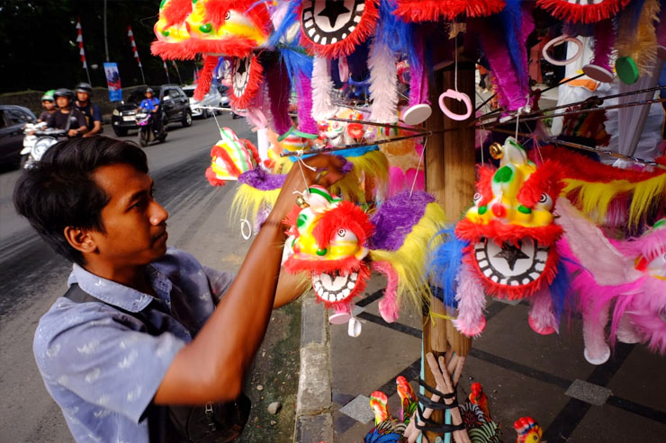 Menjelang perayaan Cap Go Meh 2025, Jalan Surya Kencana, Kota Bogor, semakin semarak dengan hadirnya pedagang yang menjajakan mainan barongsai. Mainan tradisional ini menjadi incaran warga yang ingin turut memeriahkan festival rakyat yang sudah menjadi daya tarik wisata tahunan di kota hujan. Pantauan di lokasi, Selasa (11/2/2025), para pedagang menata barongsai mini dalam berbagai ukuran dan warna mencolok, menarik perhatian pengunjung yang melintas. (Foto: Dudut Suhendra Putra)